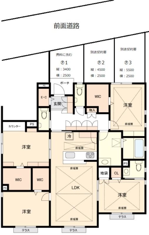 Laki 101 is a spacious 4LDK apartment offering 106㎡ of well-designed living space on the first floor of a modern three-story building completed in 2017. The thoughtful layout provides clear separation between the living and private areas, making it ideal for families or those seeking extra room for work or hobbies. Large windows throughout the residence ensure ample natural light, while the open-plan living and dining area creates a welcoming atmosphere for daily life and entertaining. Each bedroom is generously sized, allowing for flexible use and comfortable storage solutions. Practical features and efficient design contribute to a sense of ease and functionality, with standard initial costs applying for move-in.